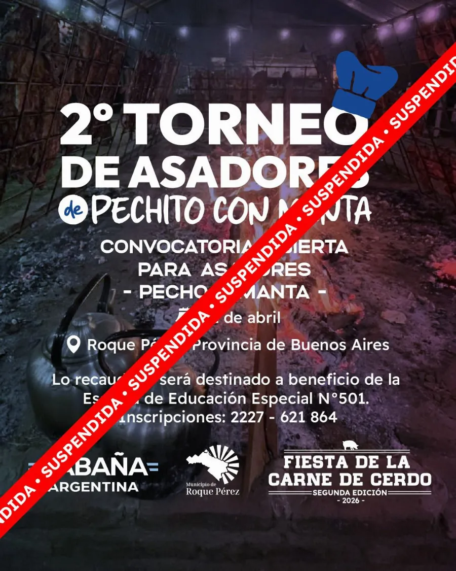 Malas noticias para los fiesteros. La economía está complicada y por eso es que el municipio de Roque Pérez informa que se decidió suspender la segunda edición de la Fiesta de la Carne de Cerdo, prevista para el domingo 12 de abril.