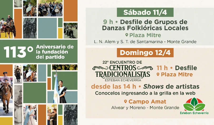 El municipio de Esteban Echeverría celebra el 113° aniversario de la fundación del partido con una serie de actividades recreativas y artísticas que se llevarán a cabo el sábado 11 en la plaza Mitre y el domingo 12 de abril en Campo Amat (Monte Grande).