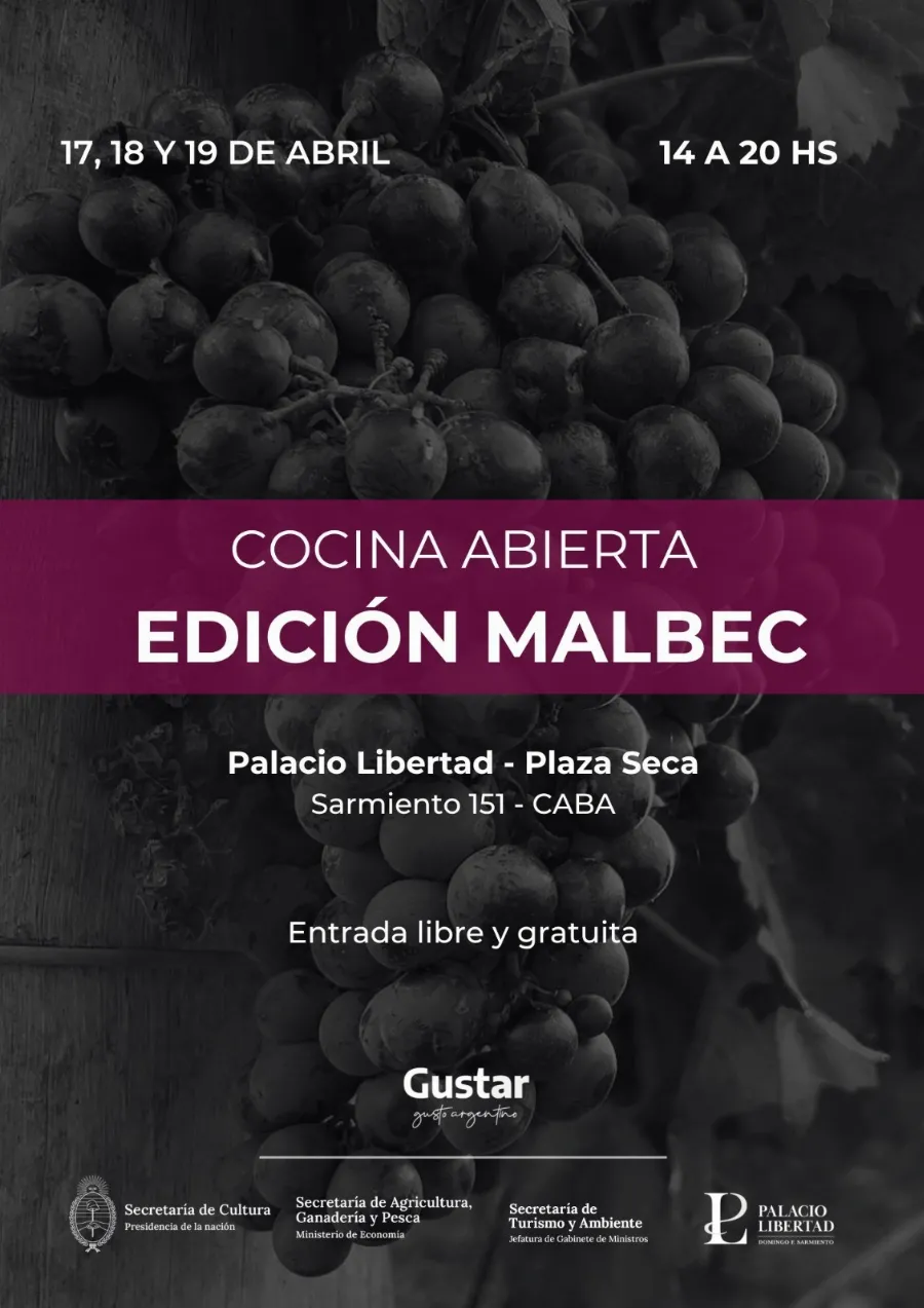 Cocina Abierta Edición Malbec estará abierta la público entre el viernes 17 y el domingo 19 de abril, de 14 a 20 h, en el Palacio Libertad (Sarmiento 151, CABA).